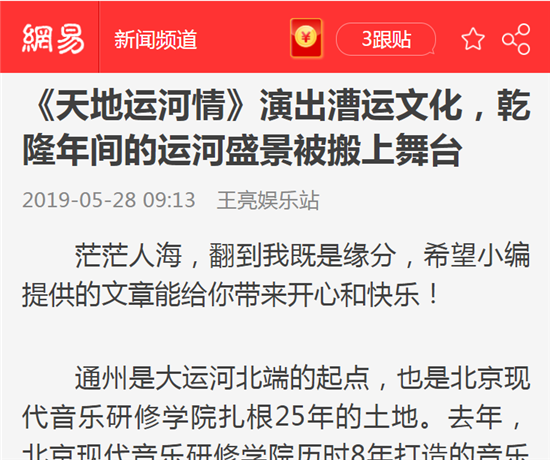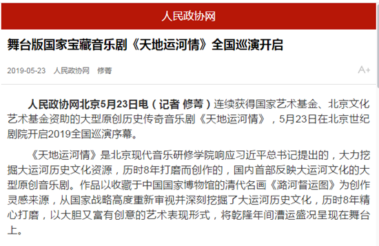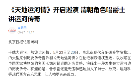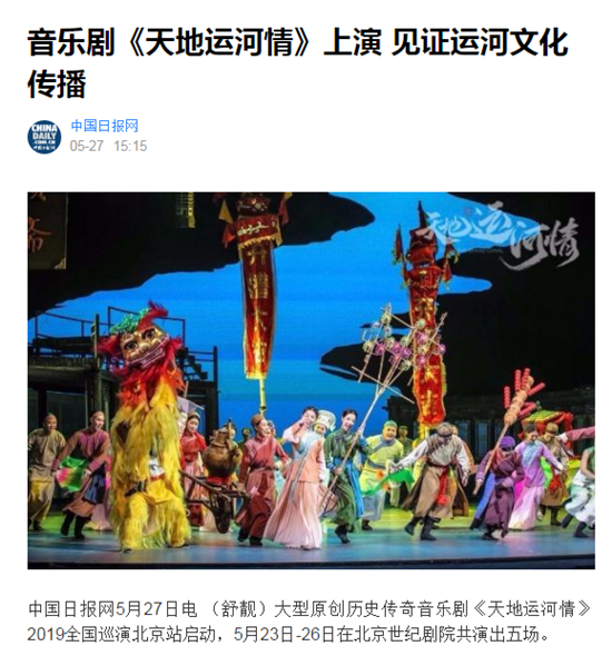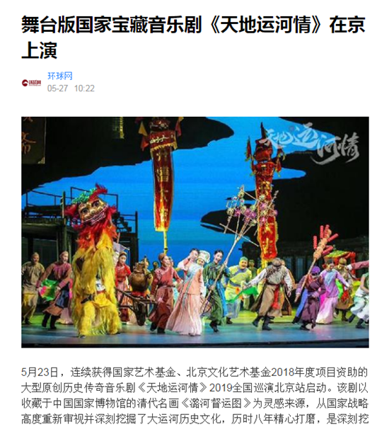 5月26日,大型原创历史传奇音乐剧《天地运河情》2019全国巡演北京站第二轮5场演出在北京世纪剧院圆满落下帷幕,演出期间,收获好评无数,引起了社会各界的广泛关注。