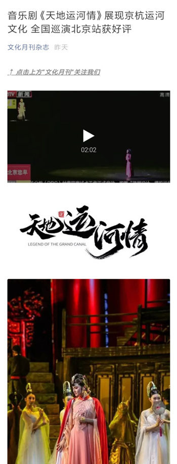 作为首部运河题材首部鸿篇巨制音乐剧,《天地运河情》自2018年6月在北京天桥艺术中心首演以来,至此次北京站巡演结束,共有3万余名观众走进剧场,共同见证了运河文化的传播。跌宕起伏的剧情、华彩大气的舞美、震撼人心的音乐、生动精彩的表演、绚丽的视听体验、丰富的舞台呈现方式,澎湃激荡的家国情怀……这一部精心打造的运河文化艺术盛宴,令人不禁惊叹国产音乐剧之震撼。