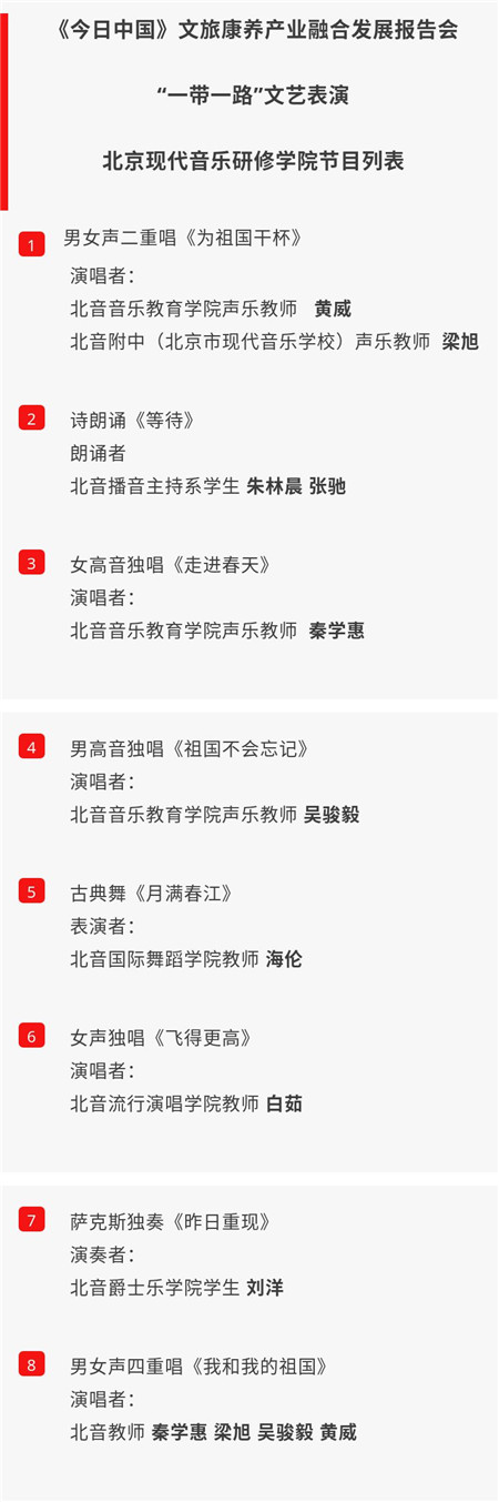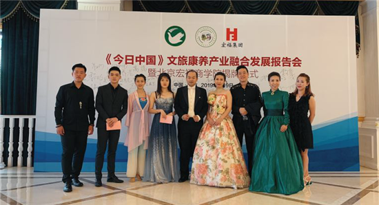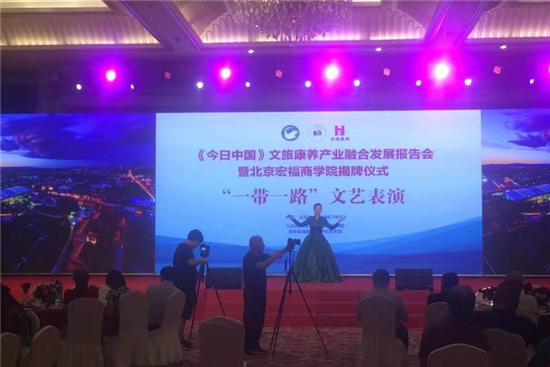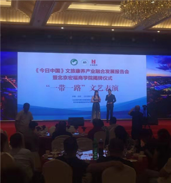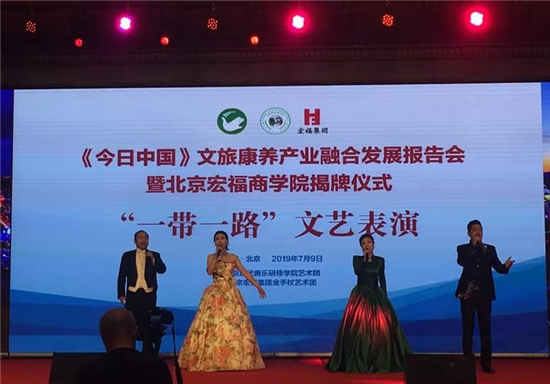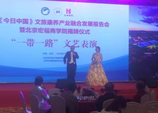 7月9日晚,《今日中国》文旅康养产业融合发展报告会暨北京宏福商学院揭牌仪式在京举办。现场,北京现代音乐研修学院北京现代音乐艺术团受邀与北京宏福集团金手杖艺术团共同带来了精彩的以“一带一路”为主题的文艺表演。