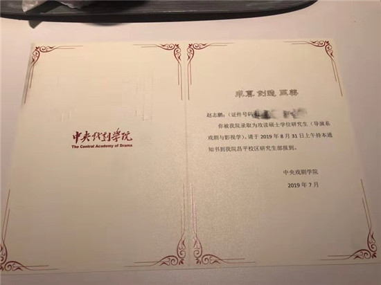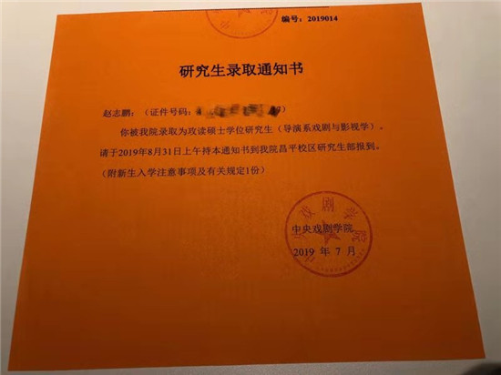 为了能静下心来学习,从8月起,赵志鹏在中戏附近租了个房子,每天8点起床,一直学习到晚上12点睡觉,每天最开心的事情就是吃饭时可以看40分钟综艺或者美剧作为放松。当时间进入11月份,临近考试,时间更加紧迫了,每天早上还是8点起床,但睡觉时间却推迟到了凌晨2点,每天6小时睡眠,加上午休1小时,就这样又坚持了两个月。“万幸最后结果还不坏!”收到了录取通知书时,赵志鹏终于松了一口气。