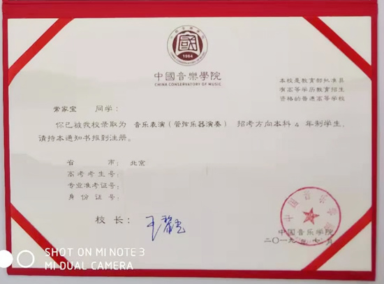近日,记者获悉,北京现代音乐研修学院附中(北京市现代音乐学校)2019届毕业生常家宝以专业第一的成绩成功考入了中国音乐学院。
