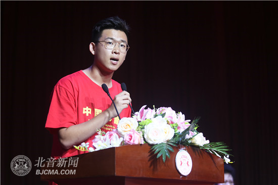 随后,影视戏剧学院张逸彬同学代表新生发言。习近平总书记曾寄语中国青年:中华民族伟大复兴的中国梦,终将在一代代青年的接力奋斗中变为现实,对此张逸彬说道:“我想,这对于我们处于发展中的北音学子来说,更能理解其中的意义。作为北音学子,我们要将艰苦奋斗,勇敢创新的精神传承下去!历史的火把交到了我们手中,我们应当紧紧握住,不负使命,争做新时代北音精神的传承者、改革的先锋队,坚定理想信念、脚踏实地,也来他个‘敢叫日月换新天’。”
