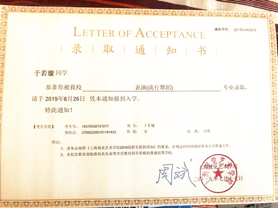 2014届毕业生刘雨昕考入天津体育学院运动与文化艺术学院