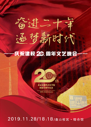 2019年,是北京现代音乐研修学院附中——北京市现代音乐学校建校20周年,“奋进二十年 逐梦新时代”庆祝建校20周年专场文艺晚会将于11月28日晚在北音盘山校区综合馆隆重举行。目前,晚会节目正在紧张排练中。