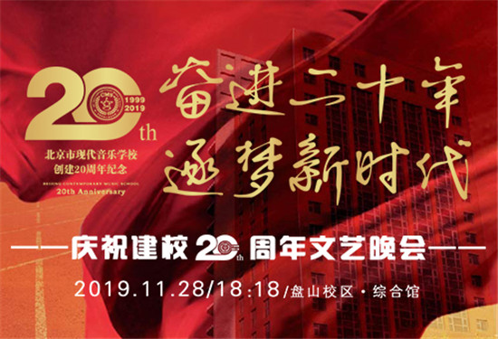 2019年是北京现代音乐研修学院附中——北京市现代音乐学校建校20周年,“奋进二十年 逐梦新时代”建校20周年文艺晚会将于11月28日18:18在盘山校区综合馆隆重登场。