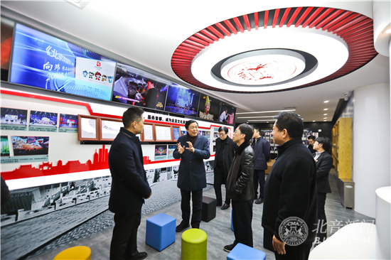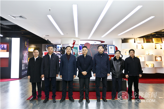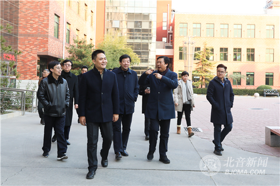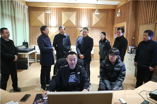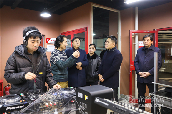 调研座谈前,汤部长一行在李罡院长等院领导的陪同下,参观了DJ教室、录音棚、北音校史馆等教育教学设施。