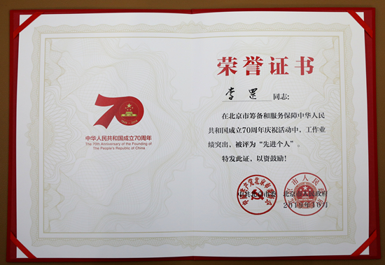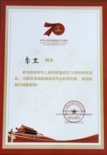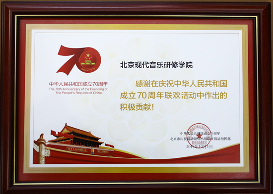 北音师生历经近四个月的艰苦排练、合练、彩排,克服了大热天、大强度、大跨度、大合作等种种不适因素,在10月1日,以饱满的热情、最佳的状态,向党和国家领导人及全国人民精彩呈现,圆满完成了国庆70周年演出活动任务。北京现代音乐研修学院因此荣获联欢活动指挥部颁发的“突出贡献单位”奖牌,李罡院长被授予“先进个人”荣誉证书。