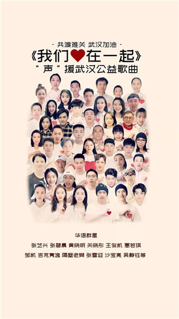 2月6日,值抗疫紧张而关键的时刻,由共青团中央、新浪网等共同发起,王俊凯、关晓彤、黄晓明、张艺兴以及北京现代音乐研修学院学子江映蓉、隔壁老樊等共同演唱的公益歌曲《我们心在一起》温暖上线,用音乐的力量治愈人心,给人们加油助力,带来勇气和希望。