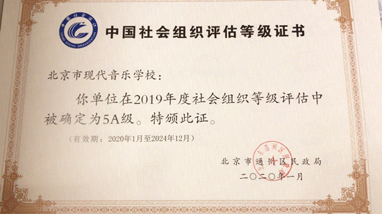 近日,在通州区2019年度社会组织等级评估中,北京市现代音乐学校(北京现代音乐研修学院附中)被评定为5A级社会组织。
