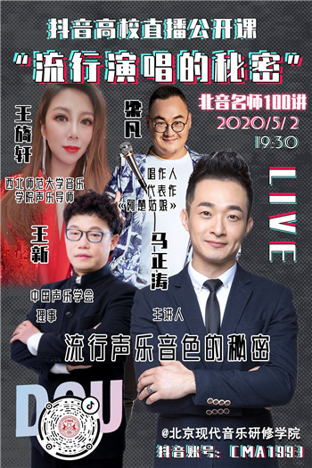 怎样制造好声音?流行声乐五种常见音色是什么?怎样建构自己的声乐歌唱体系?5月2日晚19:30,北京现代音乐研修学院官方抖音直播间(抖音号:CMA1993),北音音乐科技学院唱作系专业教师马正涛牵手王新、梁凡、王旖轩三位业内资深音乐导师,干货满满,为你揭晓流行声乐音色的秘密!