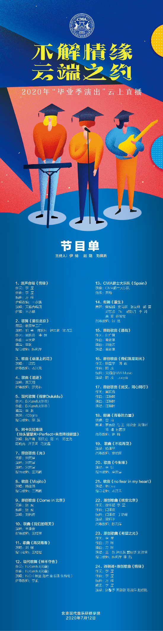 7月12日19:00云上直播的“北京现代音乐研修学院2020年毕业季演出”将以“情缘”为主题,将以现场直播与演播室直播结合的方式,多时空、多场地、多平台联动,构建5大板块近30个精彩纷呈的文艺节目,为2020届毕业生送去祝福。