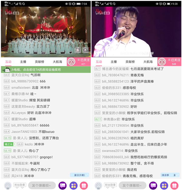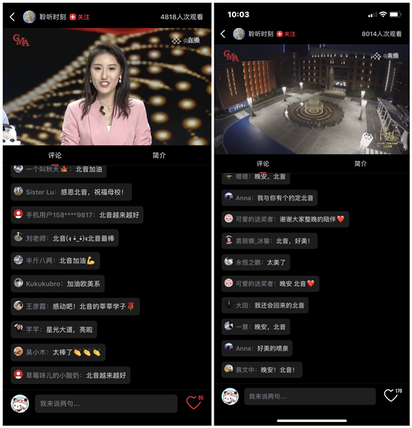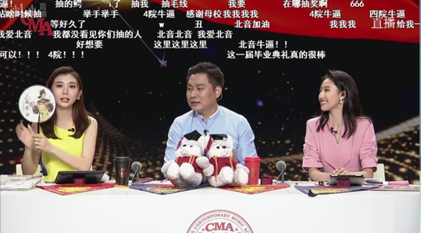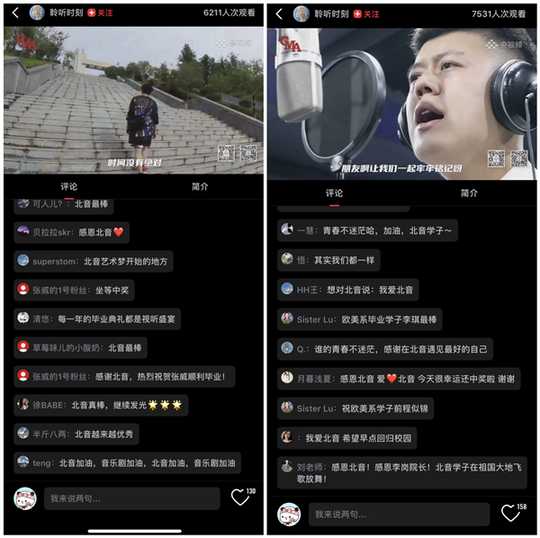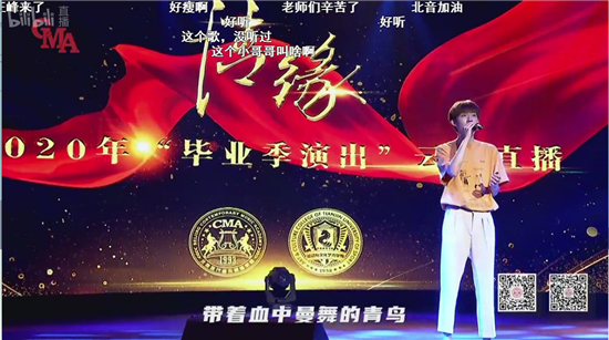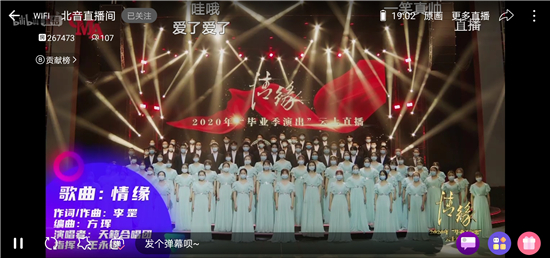 演出还特别设置了“入校记忆”“毕业感言”“畅想未来”等众多互动话题实时讨论以及抽奖赠送学院纪念品等环节。整场演出在温情互动中不断升温,同学们“我爱北音 我爱罡爸”“北音加油”"不想毕业"“想念老师 想念学校 想念食堂”“青春无悔 感恩母校”“毕业快乐”“愿有前程可奔赴 亦有岁月可回首”等评论霸占了弹幕和评论区。