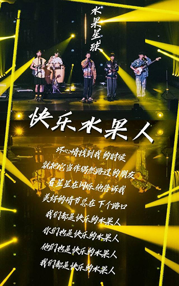“水果星球”乐队是由吉他张旸、主唱杨润泽、贝斯小智、唢呐闫永强、鼓手王舜禾五人组成。公演中,乐队先与迪斯科女皇张蔷合作演唱《别再问我什么是迪斯科》满满的年代风味,让观众们一秒代入迪斯科现场,张蔷与杨润泽自由随意的台风加上实力演唱,嗨翻全场。而后演绎的歌曲《夏日旅行家》曲风轻松愉快,乐队配合默契,现场表演新颖,获得导师们的一致认可,荣获黑胶唱片季军。