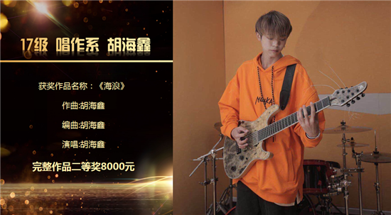 2017级音乐唱作系胡海鑫作品《海浪》获得完整作品二等奖,奖金8000元;