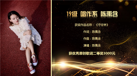 2019级音乐唱作系陈禹含作品《守望者》获得优秀原创歌词二等奖,奖金3000元;