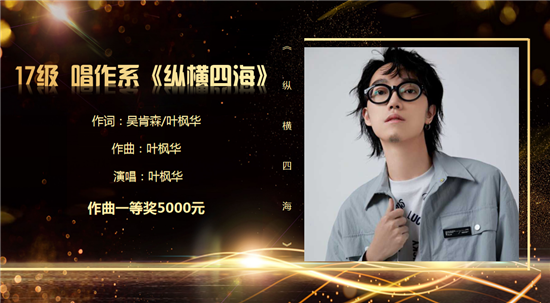 2017级音乐唱作系叶枫华作品《纵横四海》获得作曲一等奖,奖金5000元;