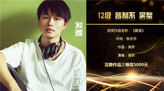 2012级音制系(音乐技术系)吴繁作品《蔚蓝》获得完整作品三等奖,奖金5000元;