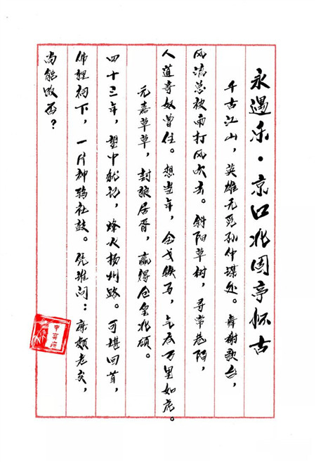 千古江山,英雄无觅孙仲谋处。舞榭歌台,风流总被雨打风吹去。