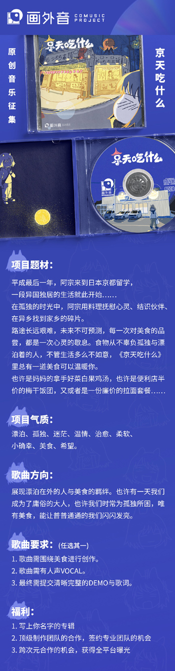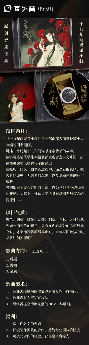 画外音计划是由光线传媒发起并策划的中国第一个音乐&原创漫画的跨界音乐专辑,将挑选光线传媒旗下“一本漫画”APP中10个优秀本土漫画IP发布先导概念片,并为之匹配一首OST歌曲,独立音乐人和本土漫画家的碰撞到底能掀起怎样的火花?期待北音学子们的优秀原创作品,投稿邮箱:176597636@qq.com,投稿截止日期:2020年10月30日。