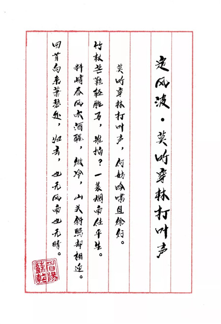 莫听穿林打叶声,何妨吟啸且徐行。竹杖芒鞋轻胜马,谁怕?一蓑烟雨任平生。