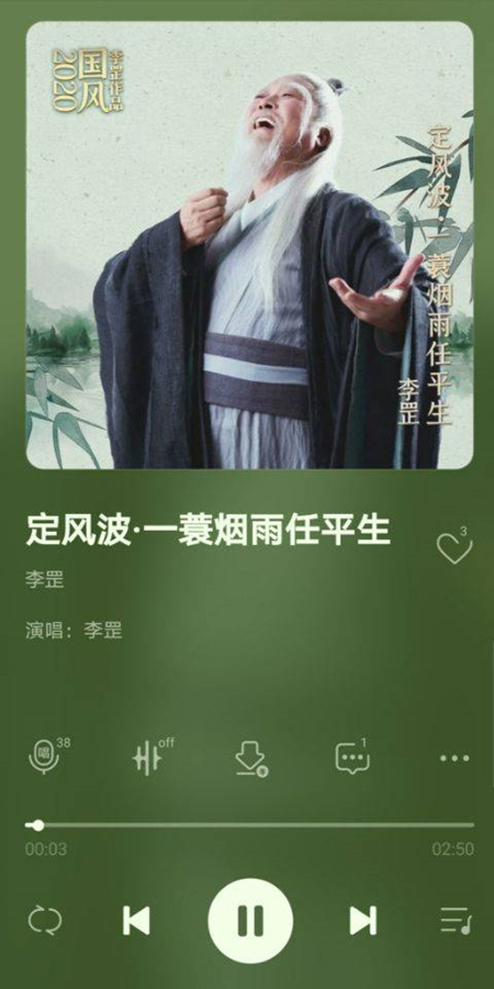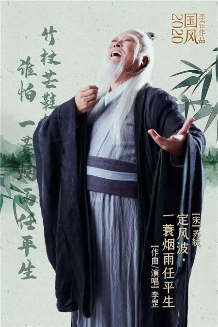 李罡院长全新谱曲的这首《定风波·一蓑烟雨任平生》正如苏轼的人生态度,肆意、洒脱,好不自在!作品中大鼓、琵琶有节奏的敲击,再加上流行音乐元素——电吉他的配器,听上去有种不惧风雨坎坷、旷达超逸的胸襟和超然情怀,充满清旷豪放之气,现代乐器与传统乐器的碰撞以及古词今语的表达,冥冥之中抒发了苏轼以及李罡院长自己不拘世事、我行我素的人生态度。