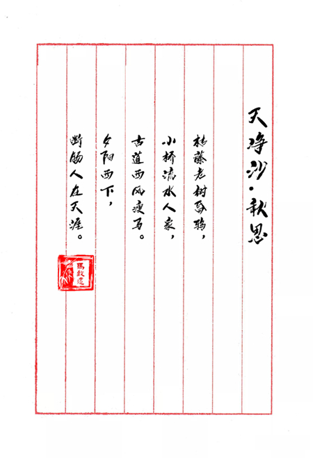 每当秋日悄然而至时,就到了必读《天净沙·秋思》的时候。就像夏天必读苏舜钦的《夏意》一样,秋天也一定绕不开马致远的《天净沙·秋思》。这个寻常的曲牌名,不知从什么时候起,似乎已成了马致远这首小令的专属名字。它本可写春夏冬,颂爱情,状月亮,咏梅花,可唯独写“秋思”时,它才呈现出最美的样子。