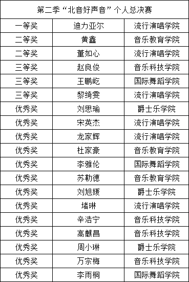 最终,流行演唱学院迪力亚尔获得第二季“北音好声音”个人总决赛一等奖,音乐教育学院黄鑫、流行演唱学院董如心获得二等奖,音乐科技学院赵良俊、国际舞蹈学院王鹏屹、流行演唱学院黎绮雯获得三等奖,爵士乐学院刘思瑜、流行演唱学院宋英杰、龙家辉、音乐教育学院杜家豪、国际舞蹈学院李雅伦等获得优秀奖。
