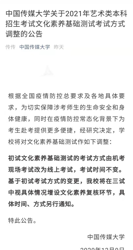 昨日,中国传媒大学发布了关于2021年艺术类本科招生考试方式调整的公告,将2021年艺考初试文化素养基础测试的考试方式由机考现场考试改为线上考试,考试时间不变。基于初试考试方式的变更,学校将在三试中视具体情况增设文化素养复核环节,具体时间、方式另行通知。