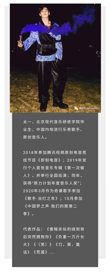 太一,是一位极具音乐天赋的歌手,音乐风格独特,是一个名副其实的全能音乐人,在台上如王者般耀眼,自信的操控着属于他的舞台!