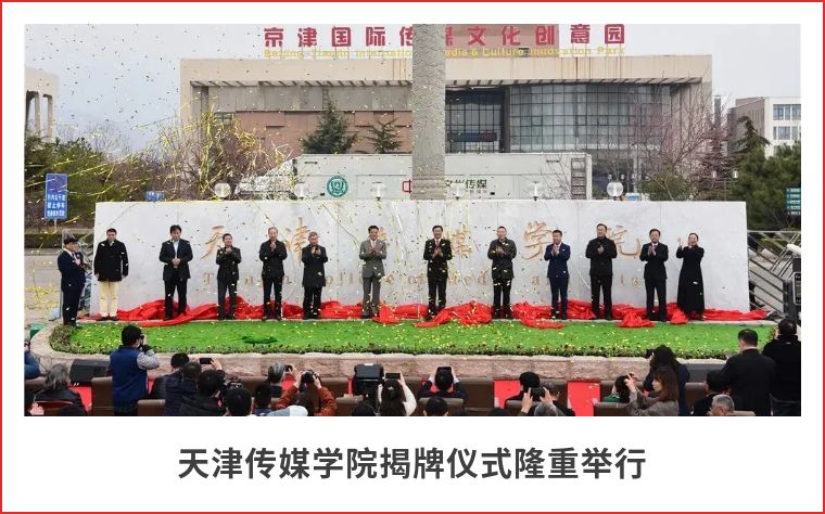 全国艺术专业学位研究生教育指导委员会主任委员、中国文联副主席、原文化部副部长董伟,中国广播电视协会纪录片委员会会长、原中央电视台副台长、中央新闻纪录电影制片厂厂长高峰,全国人大代表、全国人大财经委员会委员、民进中央常委、著名经济学家、清华大学政治经济学研究中心主任蔡继明,中国电视艺术交流协会会长李海明,中国电视艺术家协会分党组成员、副秘书长高健,中国音像与数字出版协会副理事长、音乐产业促进工作委员会会长汪京京,北京音乐家协会驻会副主席、秘书长赵金波,天津市蓟州区许家台镇党委副书记张丽娟,天津市蓟州区教育局副局长徐连旺,学校党委书记李涛、副校长尹庆民、陈红、马斌、李国强,各二级学院院长、相关处室领导及师生代表参加了揭牌仪式。