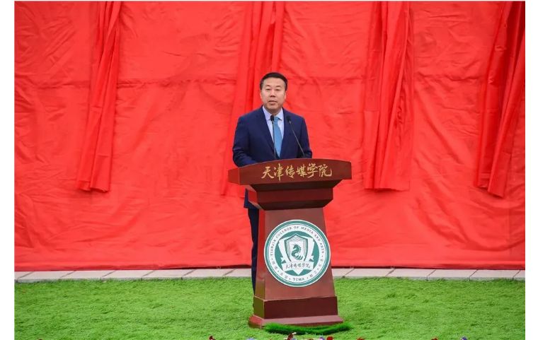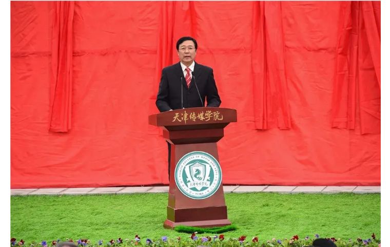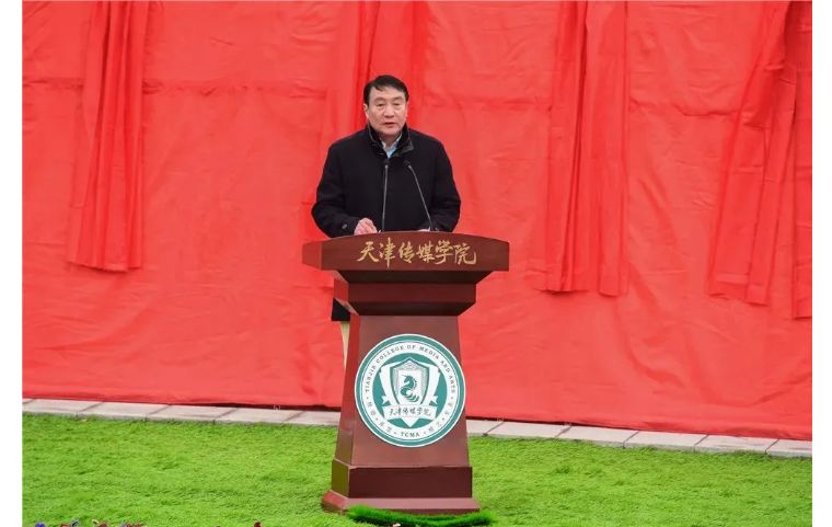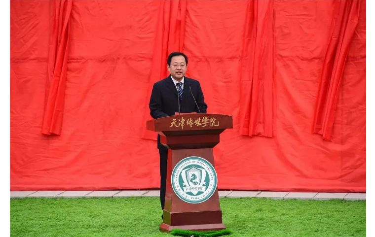 随后,天津市教育委员会民办教育处调研员殷宏宣读了《教育部关于同意天津体育学院运动与文化艺术学院转设为天津传媒学院的函》。天津传媒学院的前身是2004年2月经教育部批准成立的天津体育学院运动与文化艺术学院,建校初期由天津体育学院与天津市东奥体育发展有限公司合作举办,是以培养传媒与文化艺术类人才为主要办学定位的普通本科高等学校。2008年通过天津市学位委员会评审获得学士学位授予权。2009年1月18日,现任学院董事长李罡先生与天津体育学院签订了合作举办天津体育学院运动与文化艺术学院的协议,并在天津盘山开疆拓土建设独立校区。学校拥有土地33万平方米,建筑面积近15万平方米,规划建设面积24万平方米。目前,学校开设有艺术学、文学、管理学、教育学等四个学科门类的20个本科专业,形成了以影视传媒类专业为主体,艺术学科为特色的学科专业体系,成为天津市高校中独具特色的传媒类艺术类专业较为齐全的综合性艺术院校。