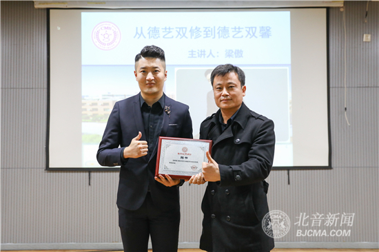 北京市现代音乐学校聘请梁傲先生为我校学生“社会导师”,北京现代音乐研修学院教育副院长郝征为梁傲颁发了荣誉聘书。报告会由北音附中德育副校长朱艳民主持。