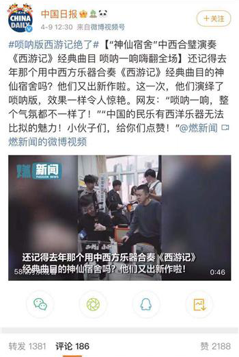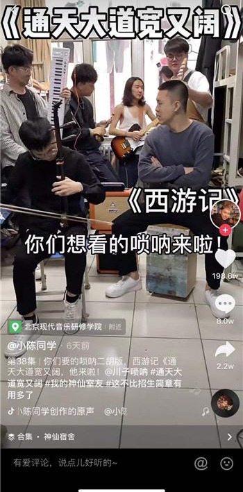 近日,北京现代音乐研修学院音乐科技学院小陈同学(陈俐卓)及其室友组成的小陈同学宿舍乐队再发新曲,他们用唢呐、二胡、箱鼓、贝斯、键盘和吉他6种乐器演奏《西游记》主题曲《通天大道宽又阔》,这一次演奏依旧让人惊艳,中国日报、北京青年报等媒体争相报道,抖音点赞量瞬间近200万,网友纷纷点赞评论:“唢呐一响,整个气氛都不一样了!”“中国的民乐有西洋乐器无法比拟的魅力!”