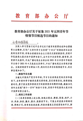 继2017、2018、2019年连续参演中央电视台“五月的鲜花”五四青年节特别节目后,2021年,北京现代音乐研修学院与“姊妹院校”——天津传媒学院再次受邀参加《2021年五四青年节特别节目》演出,北音人定将一如既往全力以赴,不负使命!