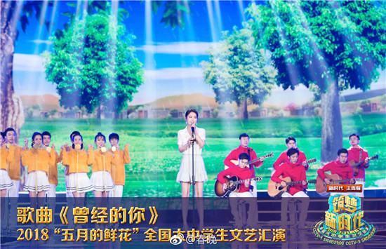 晚会上,吴磊和“国民闺女”关晓彤以情景表演的形式,演唱了《校园之歌》,带领观众朋友们,去找寻了属于自己的青春记忆。金瀚和青年演员经超作为特邀嘉宾,与吉林大学、北京理工大学、中国人民警察大学等学校的学生,共同表演了《新时代的力量》。身着军装的金瀚,再现“励志诚”的英雄本色,挥军拳,唱红歌,尽展新时代军人的热血风采。
