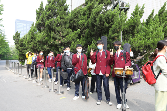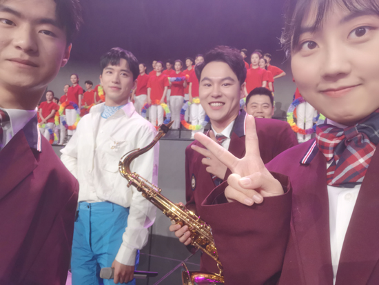 候场休息的时候,因为累到不想动弹,大家会自顾自的玩会儿手机,玩到没电后,到处找充电宝,或者跟着乐队里的张祺琦学唐山话,要么就与于翰杰一起跳社会摇,要么为带队老师杨老师普及2021新鲜词语和段子;还会,用各自不擅长的乐器互相斗技,效果堪比“车祸”现场;当然,最少不了的就是,躲着明星经纪人,用各种高难度的偷拍技术与明星合影……时光变得充实和有味道。