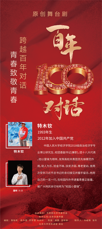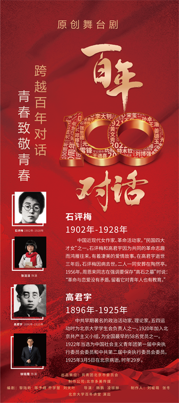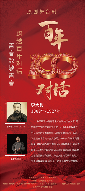 《百年对话》舞台剧是北京团市委“建党百年正青春 跟党奋进新时代”庆祝中国共产党成立一百周年系列活动的重要组成部分。全剧选取建党百年来各个时期的优秀共产党员,和当代青年进行隔空对话,探讨青年人共同关注的国家、民族、信仰、理想、爱情、价值等话题,展现中国共产党同人民风雨同舟、生死与共,从胜利走向胜利的伟大历程,讴歌一代又一代共产党员不忘初心、牢记使命的感人故事,激励广大青年自觉担负起民族复兴的伟大重任的使命担当。