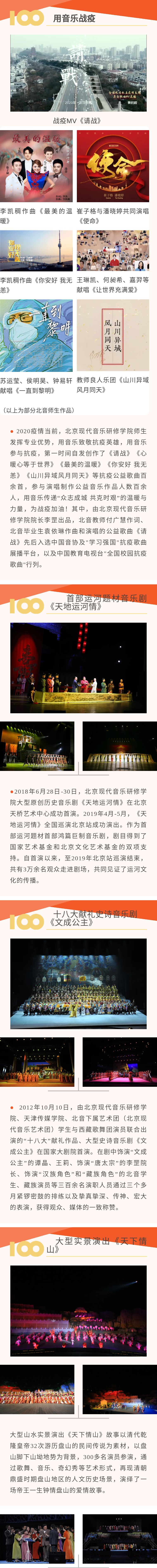 有着“中国娱乐产业人才梦工厂”之称的北音,始终坚持党对一切工作的领导,无论是在“以文艺作为时代前进号角”的党的十八大,还是在强调“以繁荣文艺创作”的党的十九大,北音都研习、深思党在文化艺术领域的出发点,积极在学院发展中全面贯彻党的教育方针、落实立德树人根本任务,秉承“产学研创一体化”的建设发展战略,先后创作了“十八大”献礼作品、大型史诗音乐剧《文成公主》,实景音乐剧《天下·情山》,擦亮大运河文化符号、历时八年精心打磨创作了首部大型历史传奇音乐剧《天地运河情》,以及近期刚刚在天津大剧院上演了由北音姊妹院校-天津传媒学院出品的献礼中国共产党建党100周年的优秀剧目《大江歌罢》;此外,学院学子还参演了水立方大型歌剧《我心飞翔》、总政歌剧团歌剧《太阳雪》、解放军歌剧院歌剧《野火春风斗古城》、大型情景舞台剧《大地铭记》、总政歌剧团歌剧《永不消逝的电波》等众多优秀大型剧目,立足北京,服务北京,成为北京文化发展的生力军。值得一提的是,在疫情期间,北音人积极投身文艺抗击疫情战场,创作了百余首抗疫公益歌曲,用音乐参与“战疫”,用音乐力量凝聚人心,为一线加油鼓劲、鼓舞士气,展现了当代高校的责任和担当。