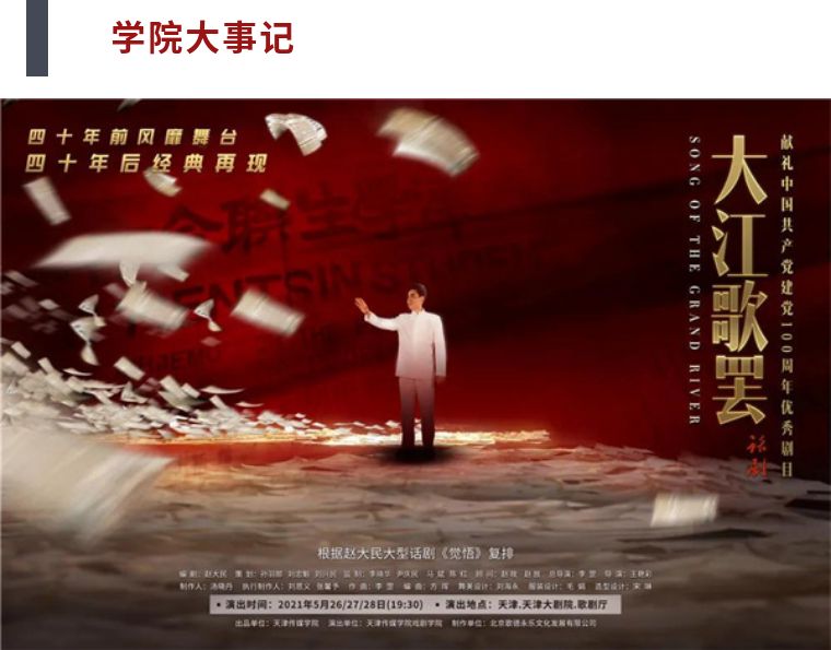 为献礼中国共产党建党100周年,2021年5月26—28日,由李罡院长担任总导演、作曲、由北音姊妹院校——天津传媒学院出品,北京歌德永乐文化发展有限公司制作的大型话剧《大江歌罢》在天津大剧院圆满完成公演。