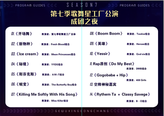 在北音流行演唱学院第七季歌舞星工厂“成团之夜”公演中,歌舞星工厂Fresh Blood组合、Mean Princessers组合、YYDS组合、AM-T组合、The Butterfly Boy组合、Miss Killer组合、Twelve组合、Heroers组合、God six组合、DMB组合、408 Girls组合、B.O组合等男团、女团带来了震撼视听的歌舞演出。