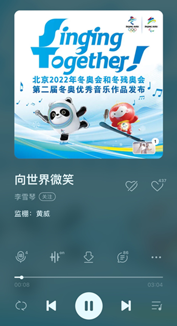 由北京现代音乐研修学院黄威老师担任声乐指导和监棚、脱口秀演员李雪琴演唱的2022北京冬奥优秀音乐作品《向世界微笑》于9月6日QQ音乐、酷我音乐等平台发布上线。作为此次助力2022北京冬奥所官宣的第一首歌曲,此曲歌词鼓舞人心,温暖治愈,用歌声传递奥林匹克力量,“向世界微笑,为一个响亮的姓名,无论谁喊北京,所有人都回应。”《向世界微笑》歌词充分体现出中国人民的自信自强,向全世界展示体育运动精神以及“一路相伴同行”的团结力量。
