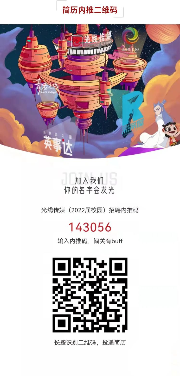 光线致力于打造中国最优质的内容产品。从 IP源头开始,重点布局电影、电视剧、动画、影视基地、艺人经纪、音乐等领域,打造影视全产业链。我们期待与热爱电影、具备专业素养的你成为同事,共同创作优秀的影视作品!