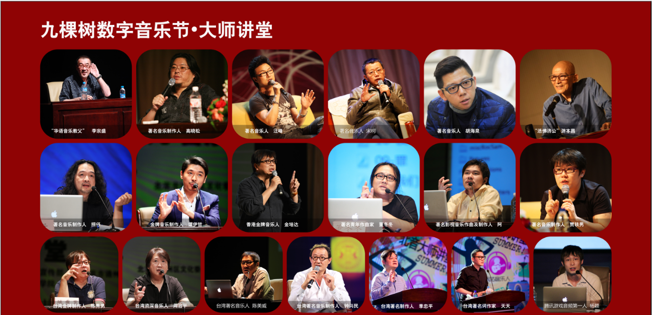 作为第七届北京·九棵树数字音乐节的重头戏,本届数字音乐大师讲堂依旧沿袭了前六届成功举办的丰富经验,并紧随当前国际、国内娱乐媒体前沿动态趋势,集结了当今音乐产业最具影响力的行业专家。力邀到著名音响师金少刚及其团队系统工程师周凤歆、Monitor调音师佐鑫,著名录音师混音师李军,中国一线电影作曲家、流行音乐编曲家、音乐制作人和中国最优秀的爵士小提琴演奏家彭飞,著名作词人、音乐人王海涛,著名音乐制作人/DJ、全球最大电音厂牌 Spinnin’Records 首位中国籍签约艺人冷炫忱,游戏音频设计师陈柏翰,歌手阿朵,著名音乐制作人陈伟伦,苗族芦笙传承人央格里,歌手、音乐制作人马RS,著名音乐制作人、华研签约词曲作者郑楠,以及与格外音乐联合邀请到曾荣获6次格莱美奖和22次格莱美提名、音乐脚步遍及欧美及亚洲地区的最最重量级的国际混音大师——Richard Furch,整个活动,可谓集结了当今音乐产业最具影响力的行业专家,来自全国的观众将不虚此行一睹到行业翘楚风采。