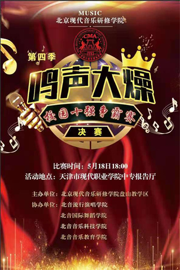5月18日18:00,北京现代音乐研修学院第四季“鸣声大燥”校园十强争霸赛绝赛将在北音盘山校区隆重登场。历经两个月的层层选拔,从276名初赛选手、24名复赛选手中脱颖而出的10名决赛选手将在现场展开终极比拼。