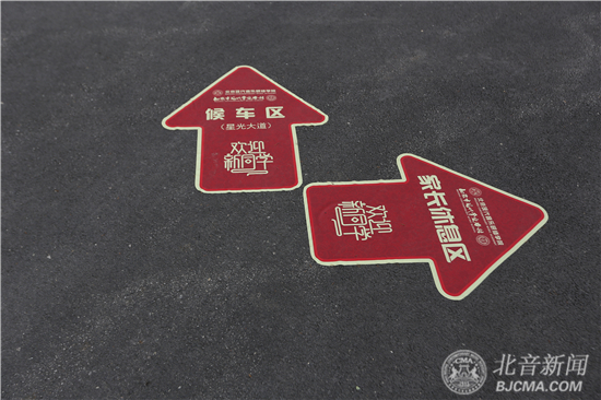 往年安置于室内的各二级院入学手续办理处,特意设在了户外宽敞的操场上,路面上贴上了去往各区域的地标。
