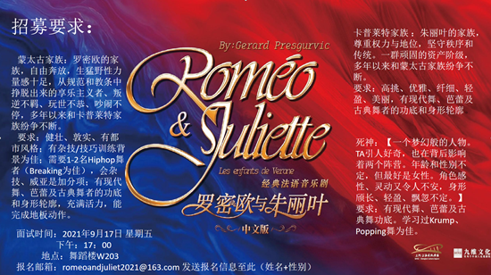 由北京九维文化传媒有限公司和上海文化广场剧院管理有限公司联合制作出品,携手中国东方演艺集团有限公司、大麦Mailive、北京演艺集团共同打造的中文版音乐剧《罗密欧与朱丽叶》将于2021年11月下旬至2022年1月下旬在上海、北京、杭州、深圳展开巡演工作。该剧剧组将在北京现代音乐研修学院现场招募舞者若干名。