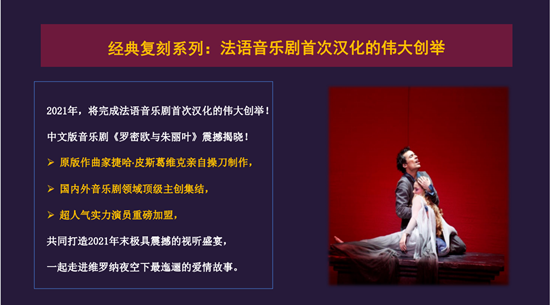 中文版《罗密欧与朱丽叶》在将意式爱情、法式浪漫与中文的优美相结合的冒险之旅中,承继了法语版音乐剧的DNA,保证原版的灵魂与风味;剧目汇聚了中国超一流的金牌制作团队,将音乐与制作全面升级,并邀请到了中国各领域最顶级的歌者,以璀璨星光为爱情发声。