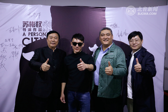 李罡院长(左一)、影视戏剧学院院长吴迪(右二)与影片导演苏彬权(左二)等合影